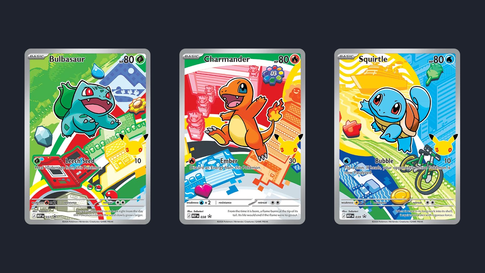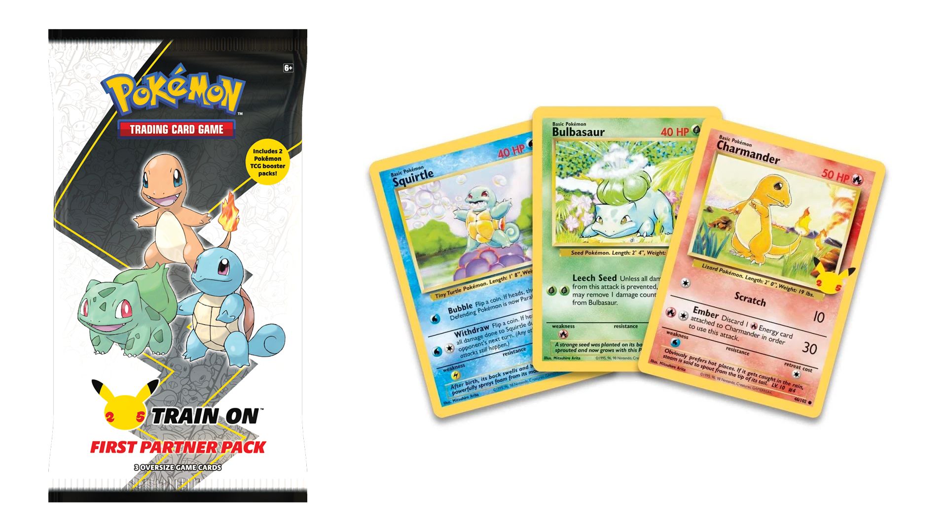 Image of the Kanto First Partner Pack, and the jumbo promo cards within it, from Pokémon’s 25th anniversary product line in 2021.