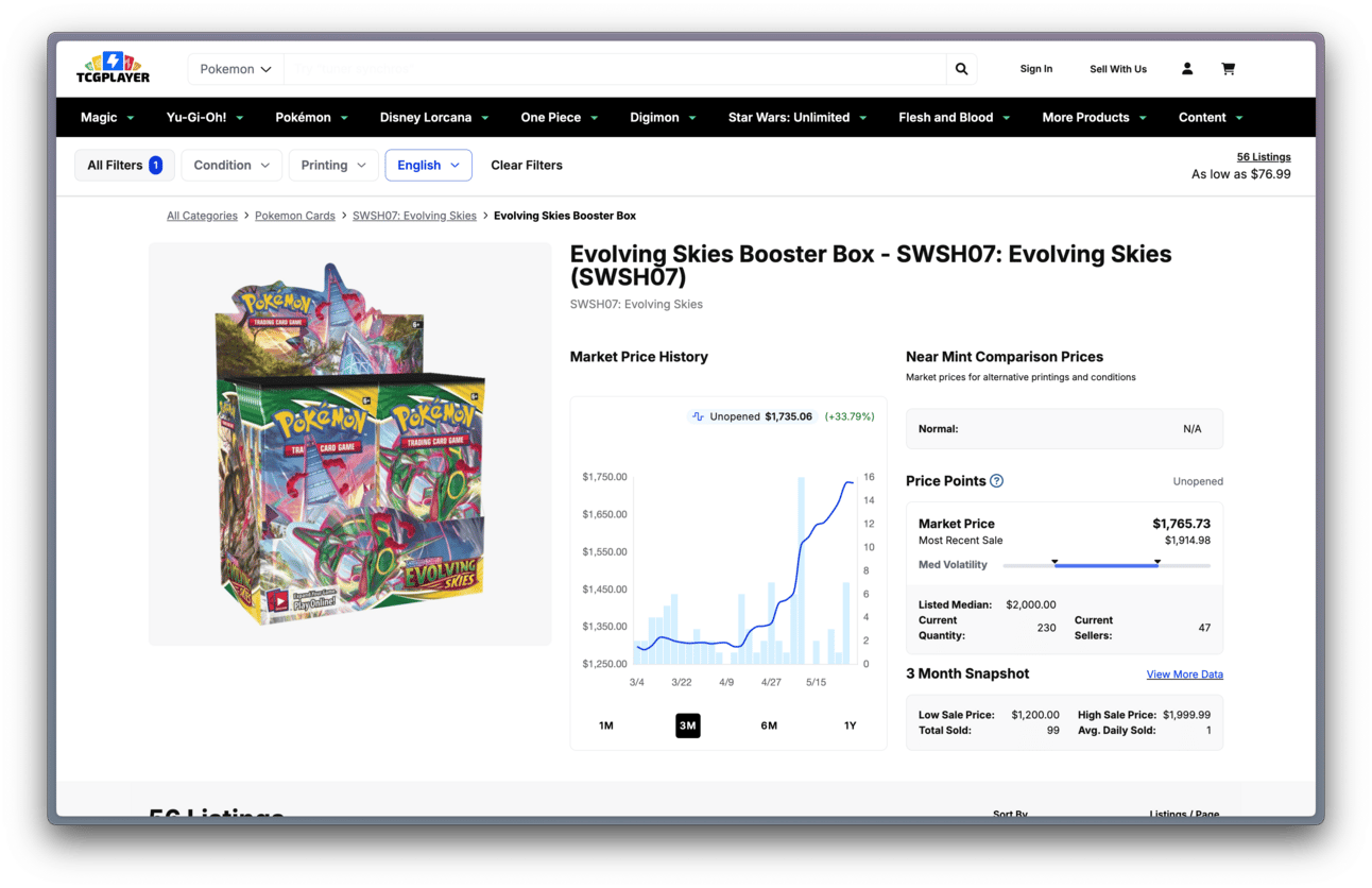 Evolving Skies booster boxes, meanwhile, have captured the attention of the hobby once again as the English market exploded into yet another Boom Phase and Evolving Skies booster boxes have reached a shocking TCG Player market price approaching $1,800!