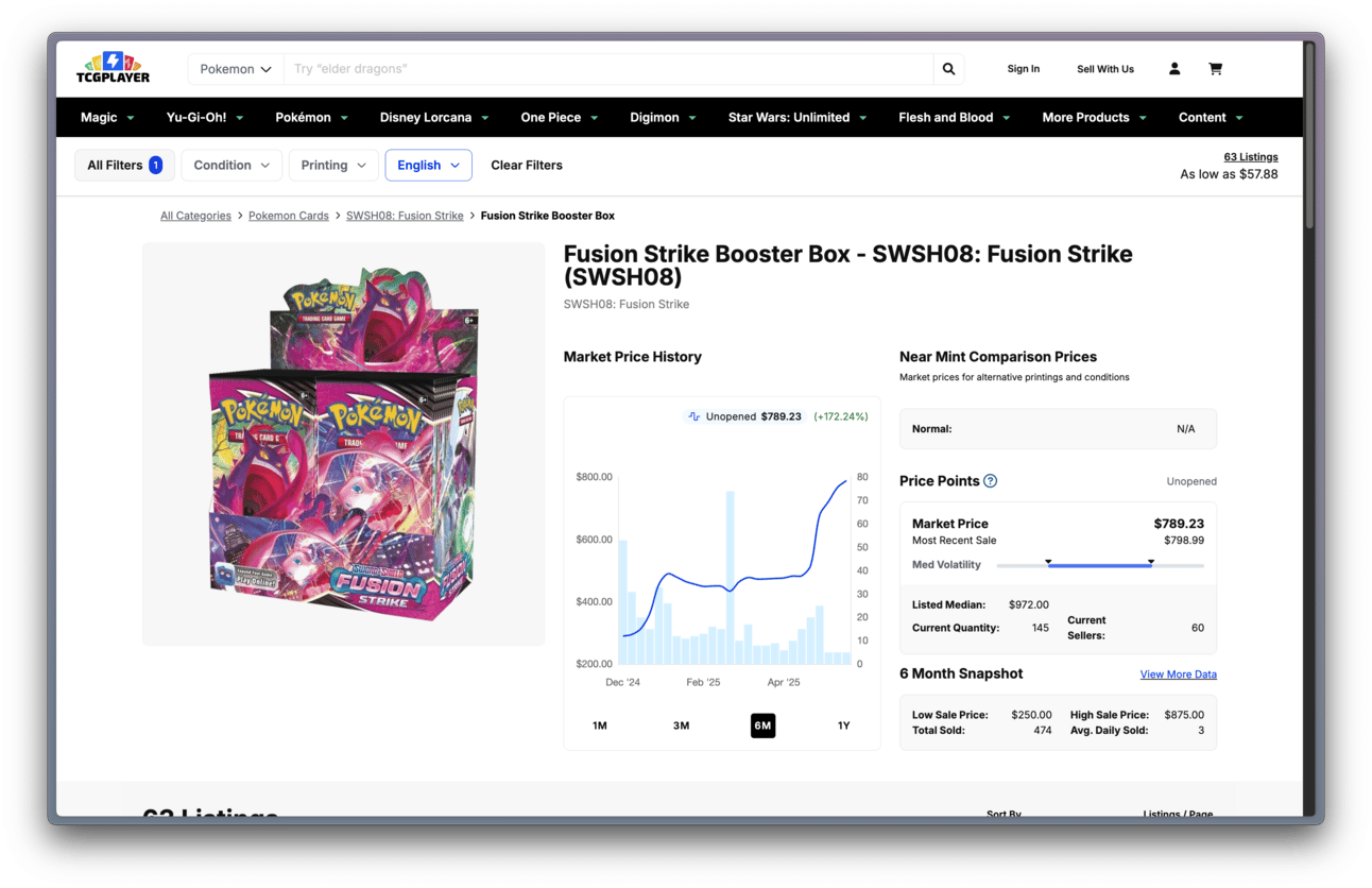 And the booming English market has driven other products, like the Fusion Strike booster boxes, to similar highs. Fusion Strike alone has moved from $290 to $800 a booster box in only 6 months.