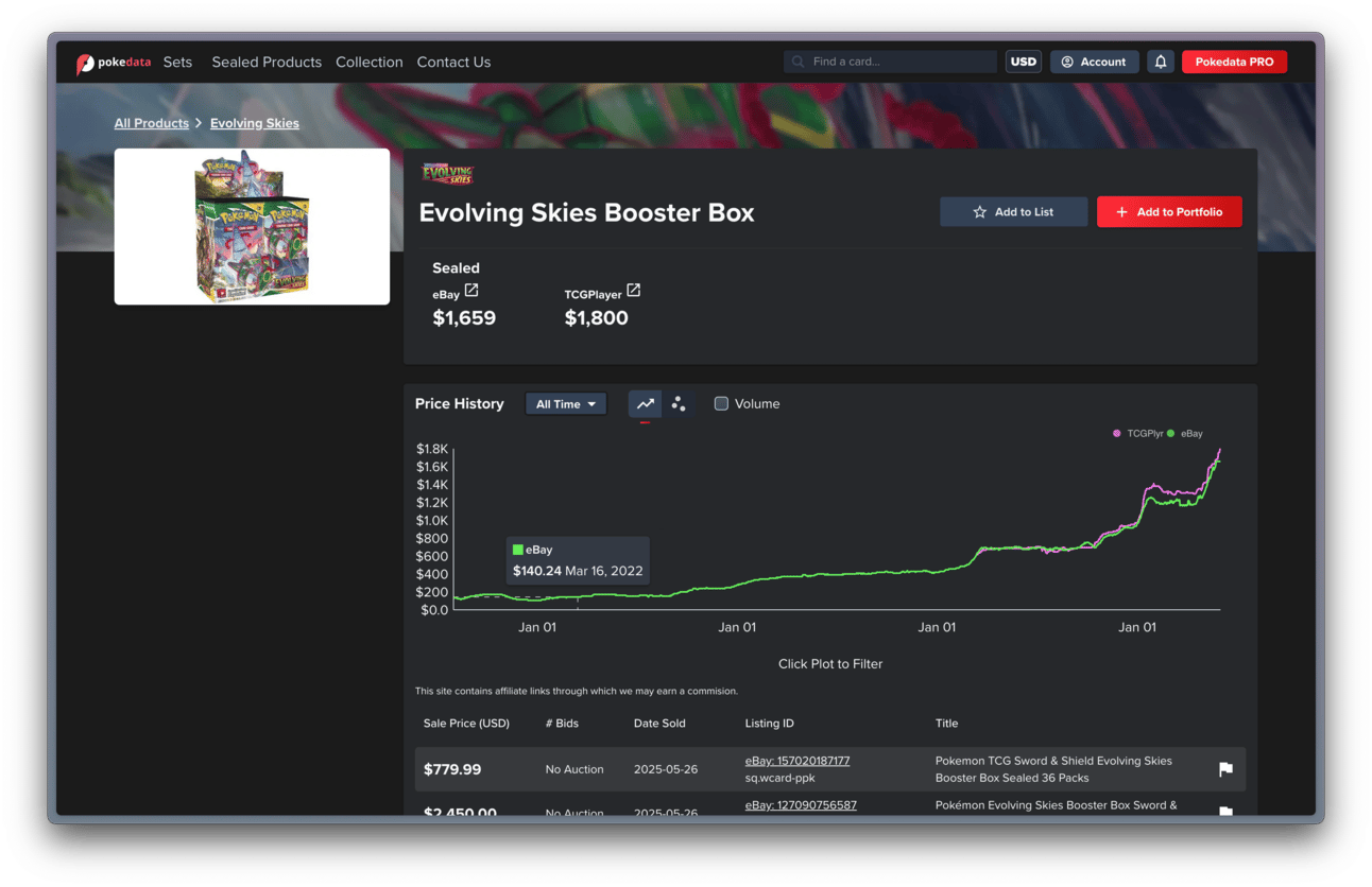 Evolving Skies had come down from it’s all-time-high prices around its release, although it did not fall as much as sets like Chilling Reign and Fusion Strike. It was still relatively available below $150 USD at the time.