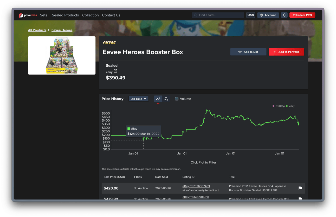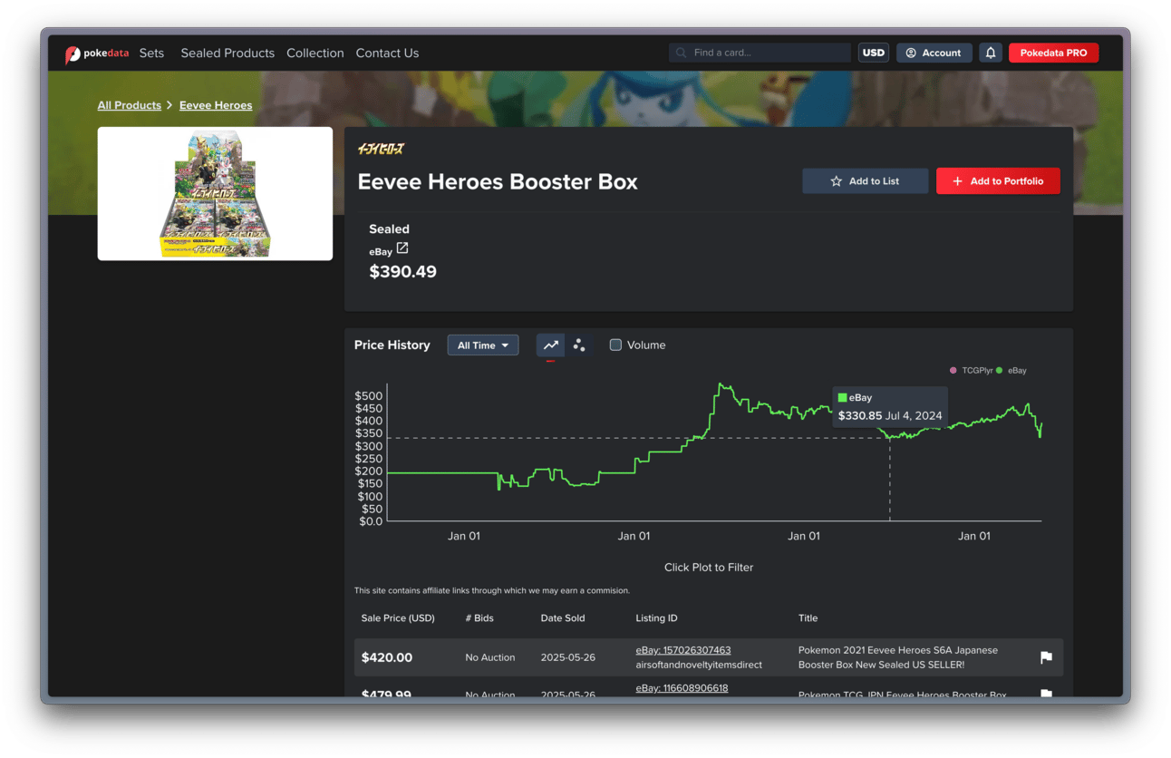 Eevee Heroes booster box price in July 2024, as shown on pokedata.io.