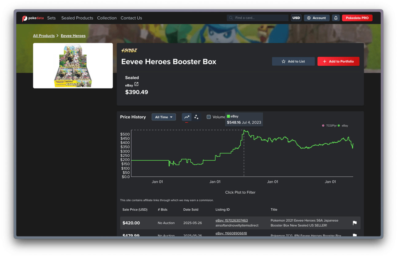 That changed in 2023 when the Japanese market entered a dramatic Boom Phase, driving prices of Eevee Heroes booster boxes from those $150 USD lows to as high as $550 USD by July 2023.