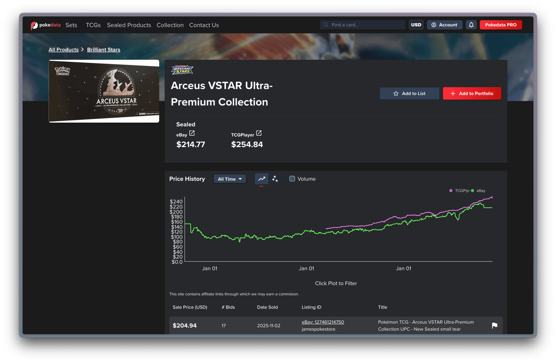 Pokedata.io price history for the GameStop exclusive Arceus VSTAR Ultra-Premium Collection, showing steady price appreciation since release.