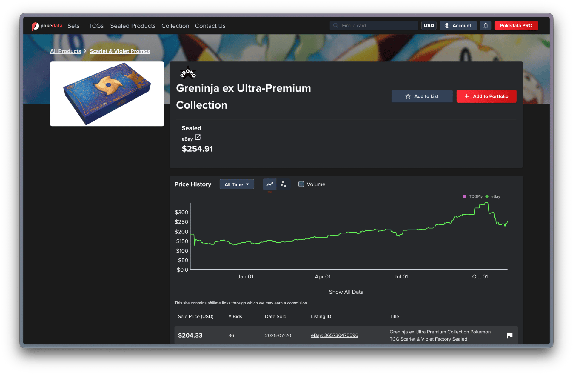 Pokedata.io price history for the GameStop exclusive Greninja ex Ultra-Premium Collection, showing steady price appreciation since release.