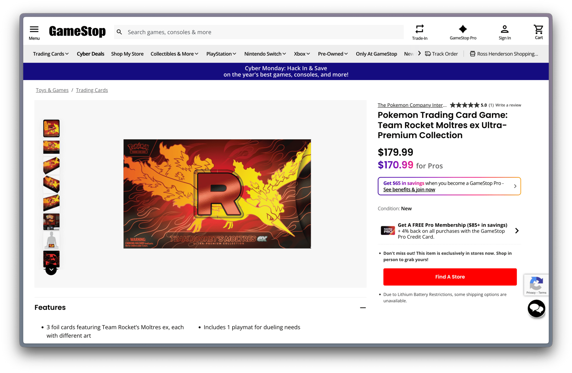 GameStop’s release price for the new Team Rocket Moltres ex Ultra-Premium Collection, a $119.99 MSRP product being sold for $179.99.