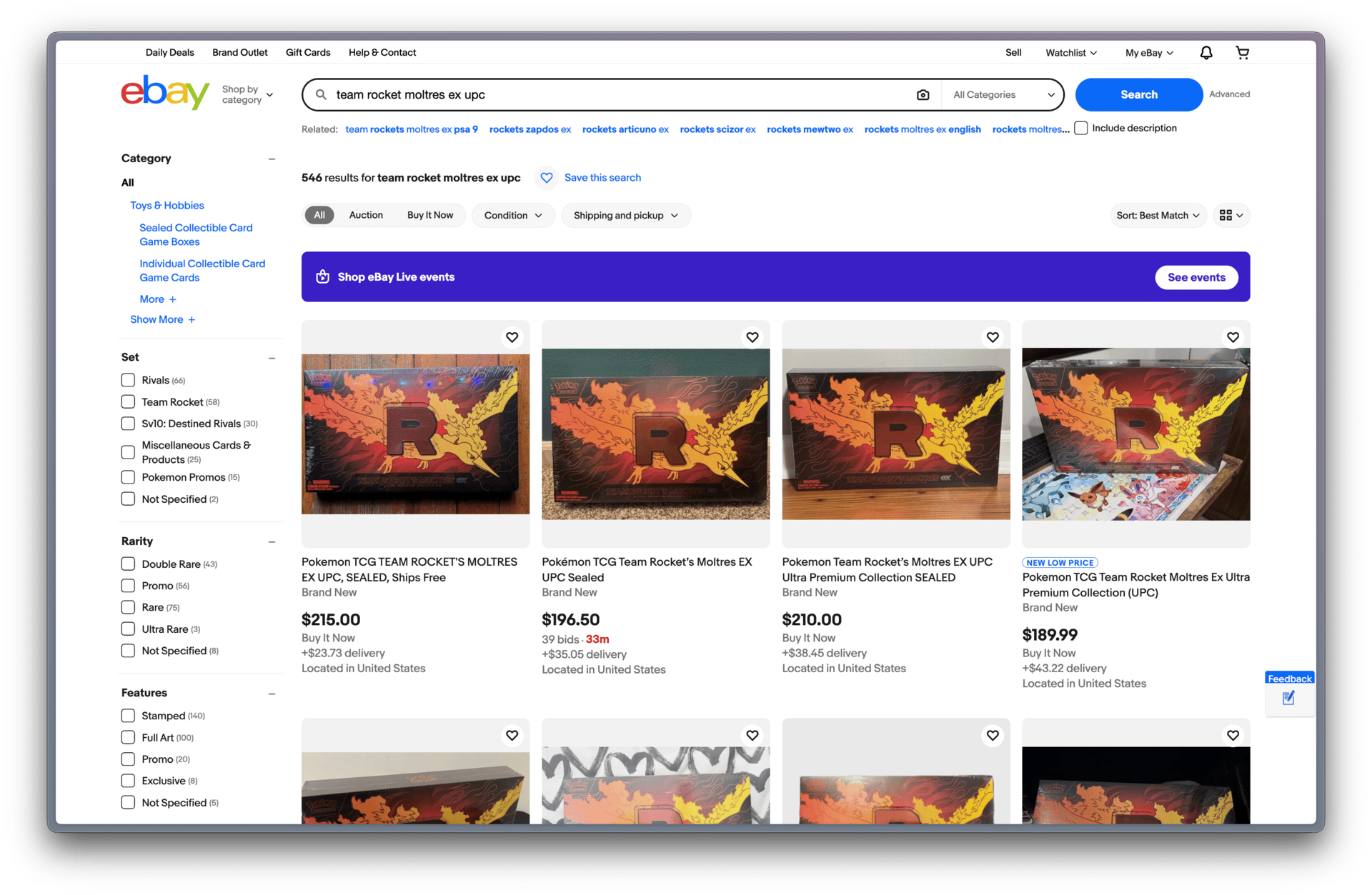 eBay listings for the Moltres UPC, showing prices around $200 or more.