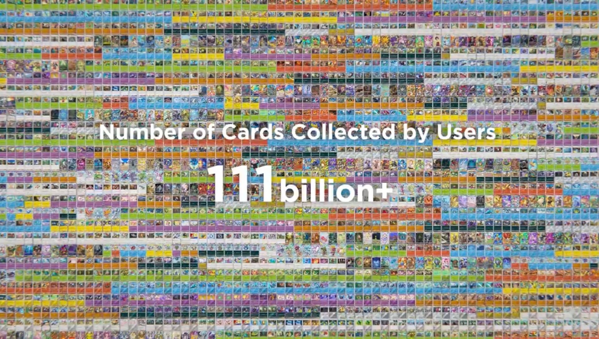 A still frame from the PTCGP 1 year anniversary video showing that more than 111 billion cards were collected in the first year.