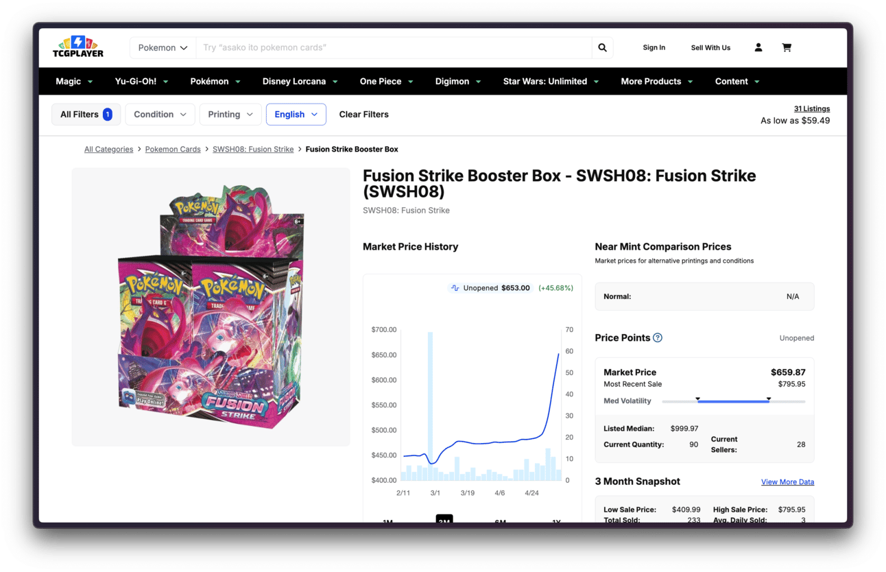 I first spotted this trend with the price movement of Evolving Skies, but it is not the only modern product seeing a surge in interest: Fusion Strike booster boxes might actually be the bigger story.