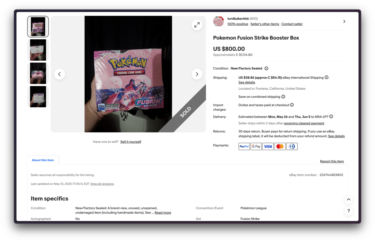 A recent Fusion Strike booster box sale on eBay with an $800 USD price