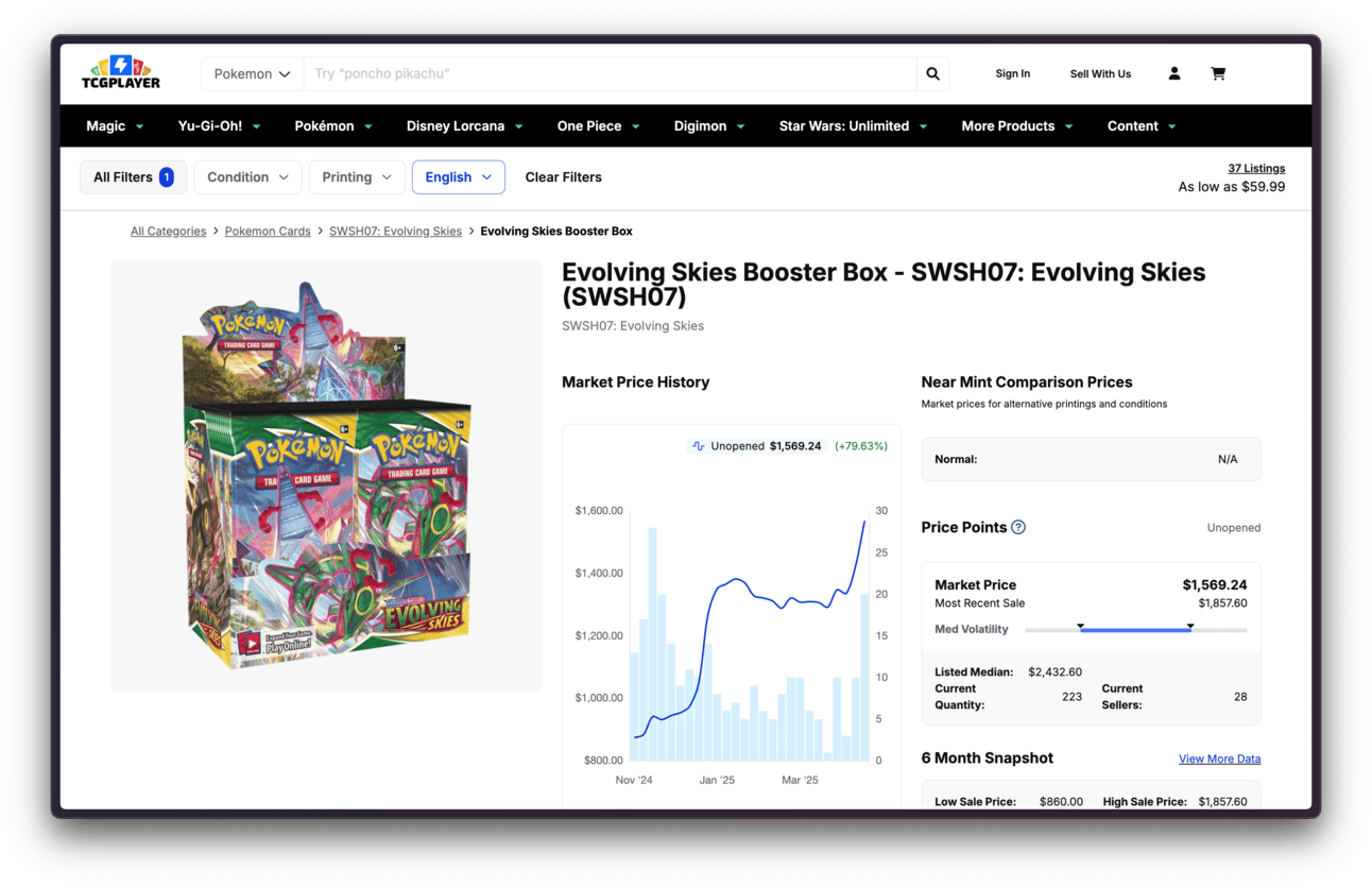 This week, I was delighted to see that prices for Evolving Skies booster boxes, which have been mostly flat for the past 3 months, are suddenly rising again.
