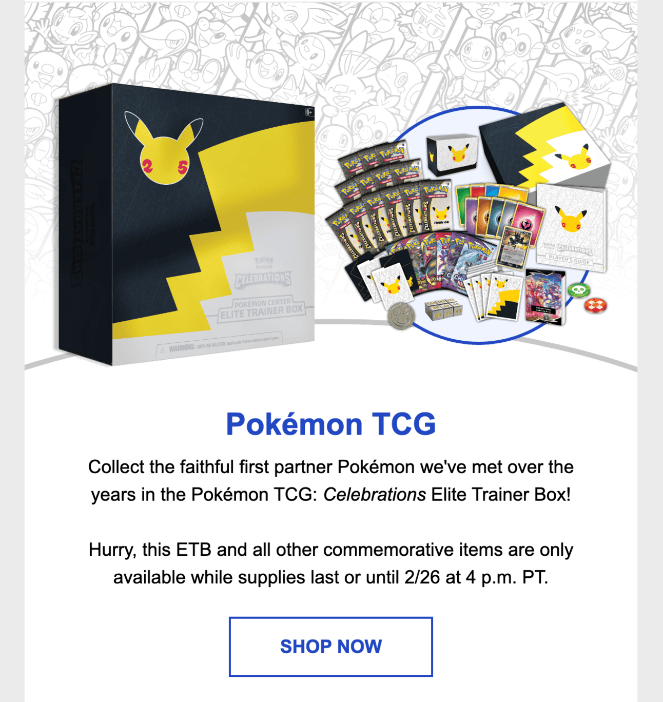 In this email, the Pokémon Company announced that all Celebrations products would no longer be available by Feb 26th, 2022 at the latest: the day before Pokemon Day, and the last day of Pokemon’s 25th anniversary year 🤯