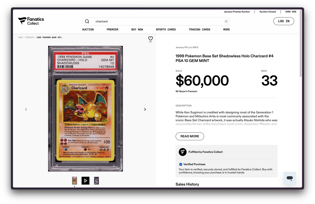 Out of nowhere, a PSA 10 copy of the Base Set Shadowless Charizard just sold for $60,000 on Fanatics Collect.