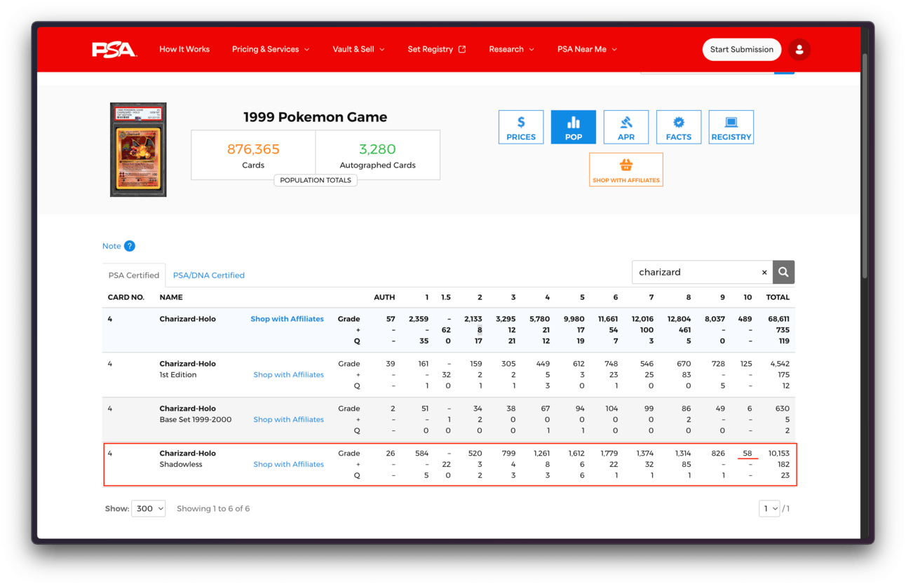 And, beyond that, it's important to recognize the true difficulty of acquiring these kinds of top-tier pieces. The Base Set Shadowless Charizard has more than 10,000 graded examples at PSA alone, but only 58 (about half a percent) have earned the coveted PSA 10 grade.